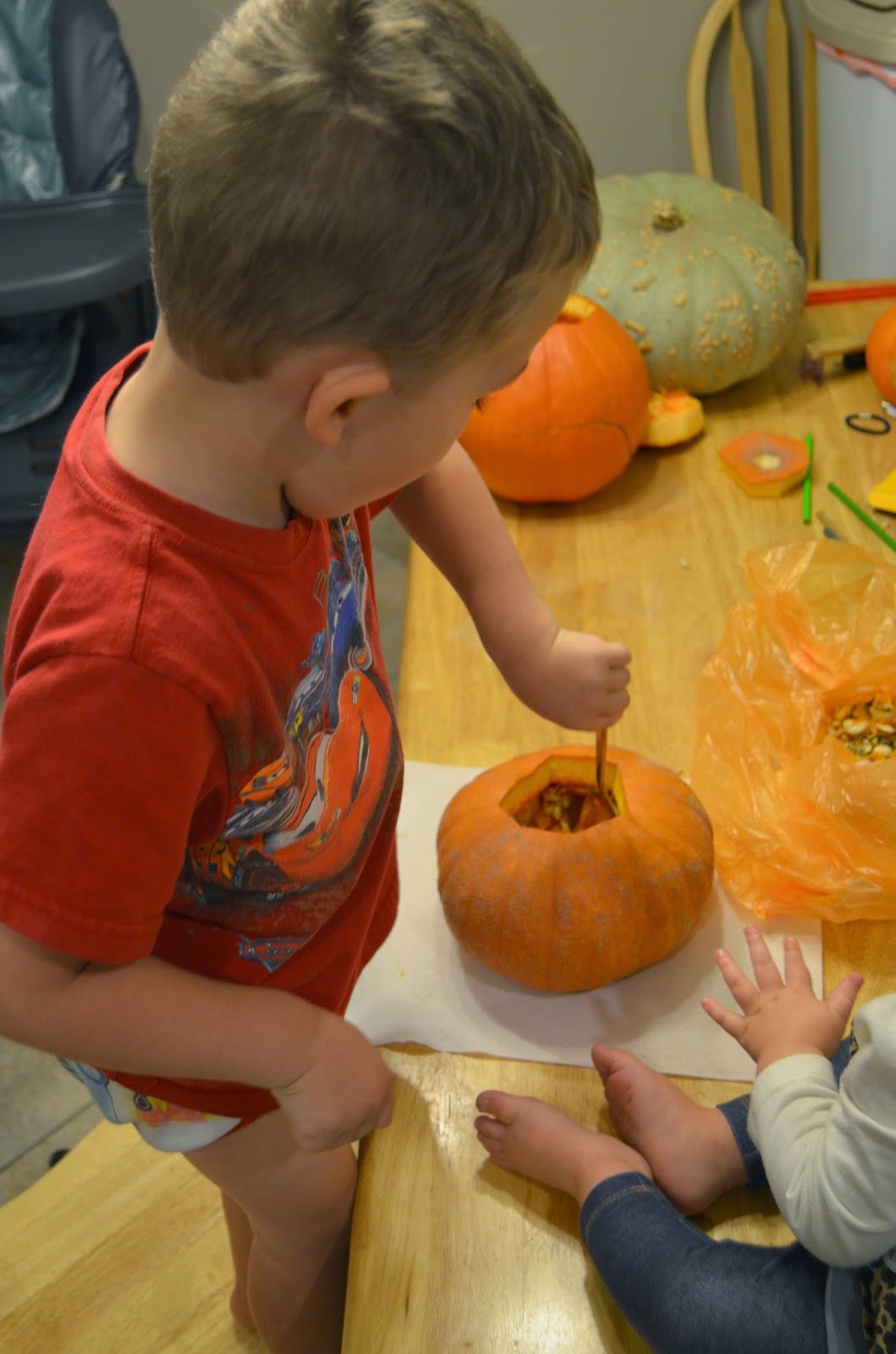 It took a moment, before Carson stuck his hands in to get the pumpkins seeds, he finally decided he would much rather have a spoon.